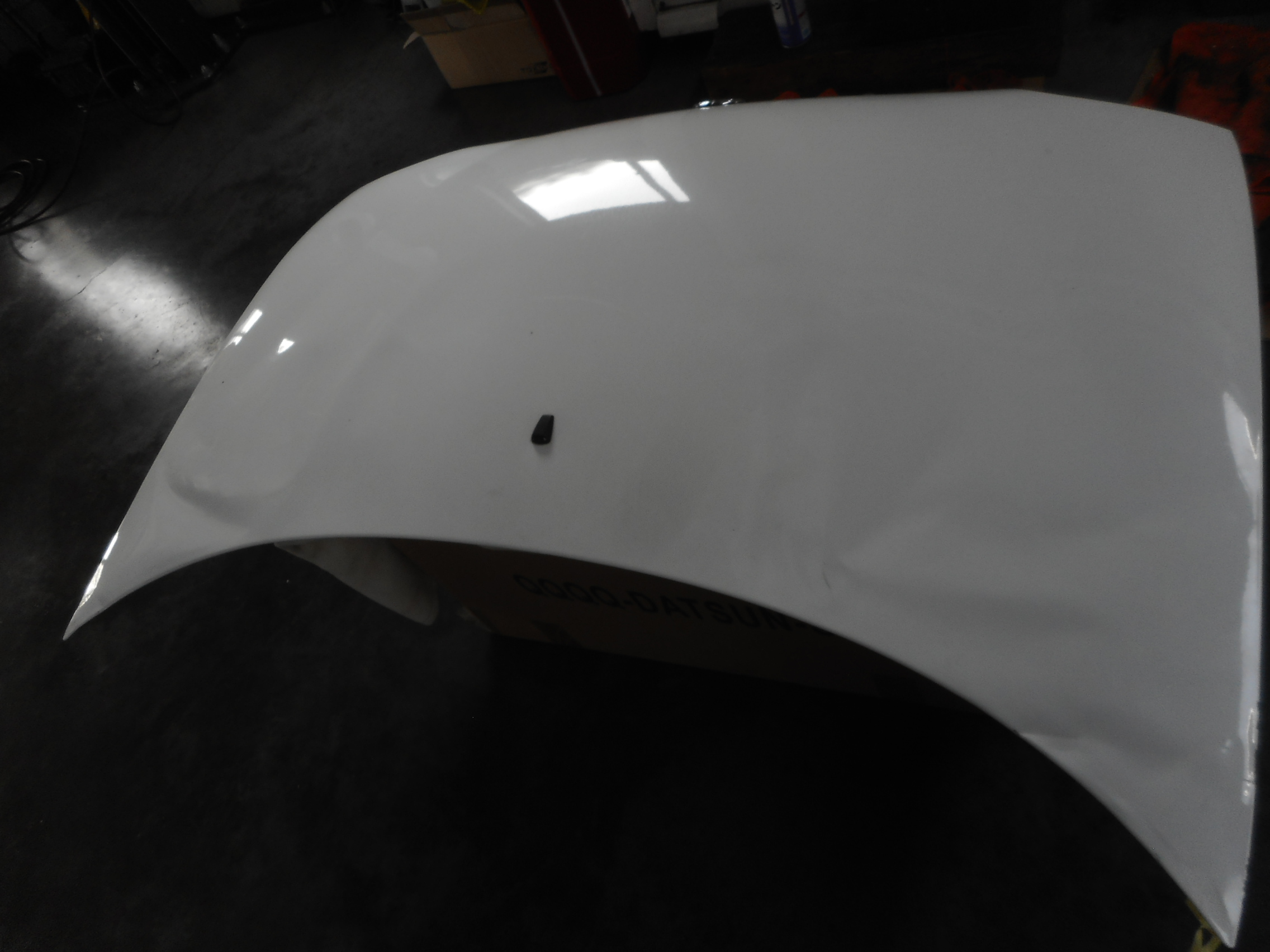 オーナーさんが走行中にボンネットが開いてしまいびっくり!事故にはなりませんでしたがヒンジ、ボンネットがベコべコ、幸いガラスや事故には至りませんでしたが、さぞやびっくりされたかと。そのような経緯で伊豆からガムテープを張りご来店。廃車の心準備でしたが板金屋さんも???でしたので仕上がりは求めずとりあえず直すことに。